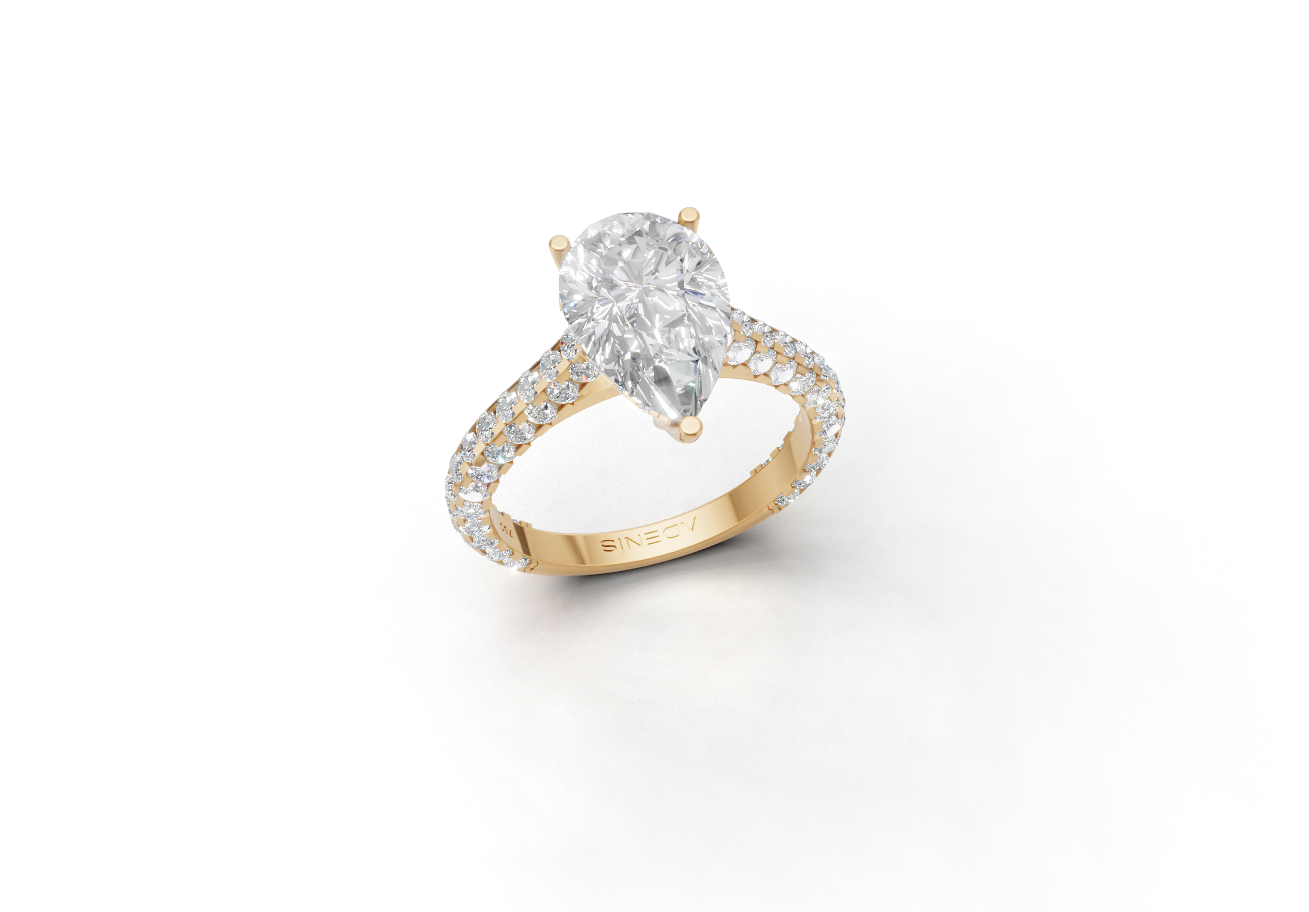 مزيج ساحر من الألماس بقطع كمثرى والألماس الدائري اللامع، مثبت في ذهب عيار 18 قيراط متألق، مصمم لتعزيز البريق والعمق.