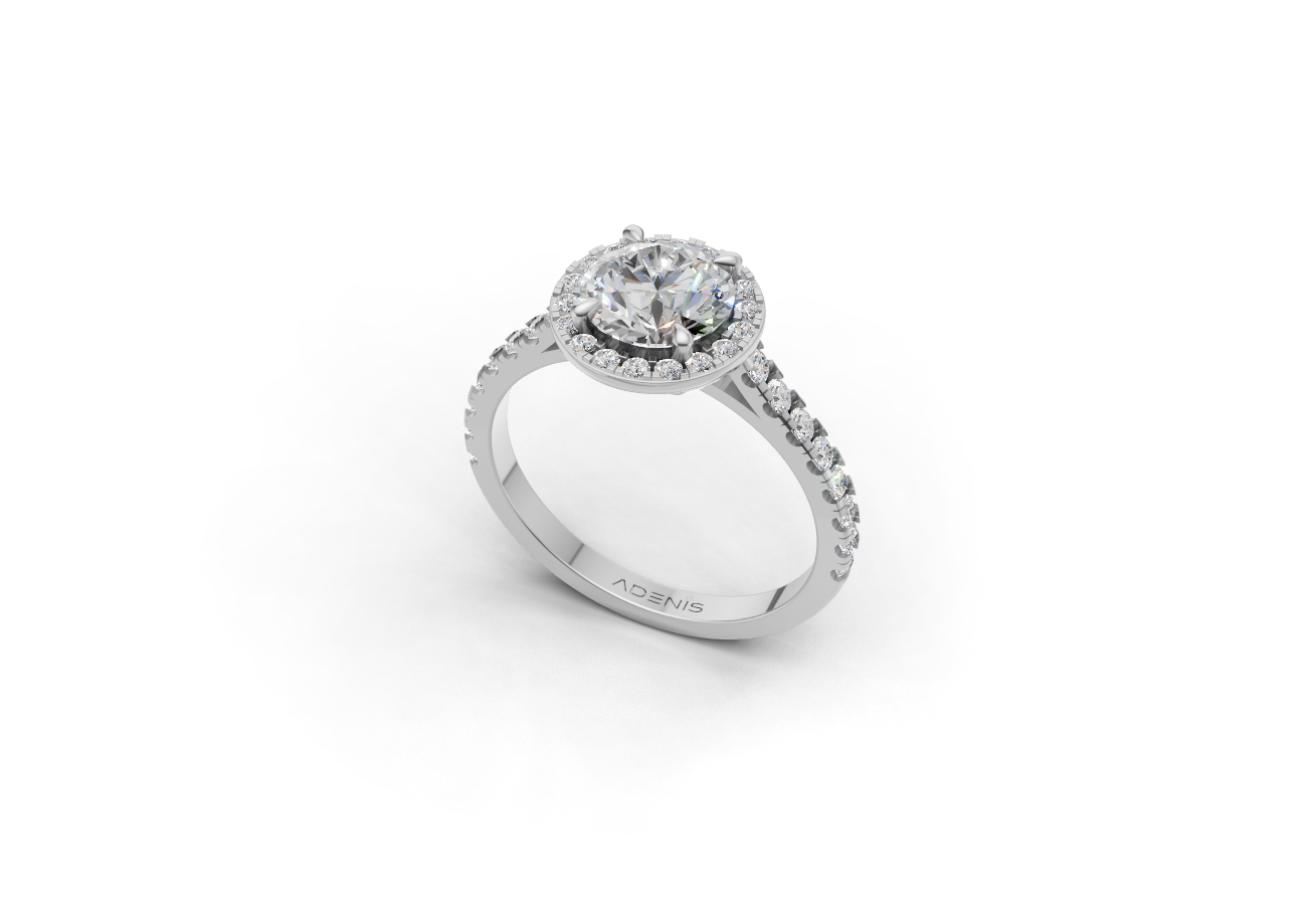 تصميم خالد وبريق مشع، يتميز هذا الخاتم المصنوع من ذهب عيار 18 قيراط بحجر ألماس مركزي رائع يحيط به هالة دقيقة من أحجار ألماس أصغر، مما يزيد من حجمه وبريقه. الترصيع الكلاسيكي يجمع بين الأناقة والرقي، مما يجعله خيارًا استثنائيًا للخطوبة أو للاحتفالات المميزة. يمكن أيضًا تخصيص هذا التصميم حسب حجم الألماس المفضل لديك، ونوع الترصيع، ولون الذهب الذي تختاره.