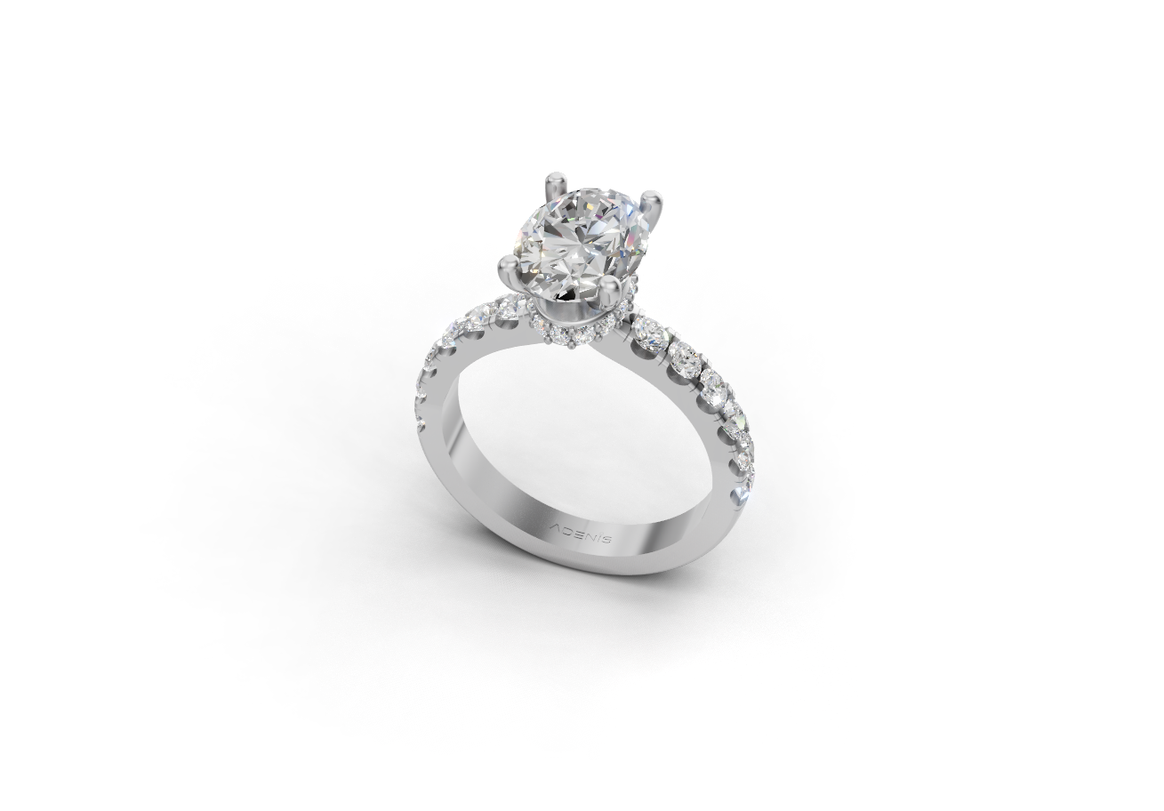 Великолепный овальный бриллиант, закрепленный в прочном золоте 18 карат и дополненный круглых бриллиантов для усиленного сияния.